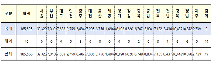 신규 확진자의 감염경로를 보면 국내 지역발생(국내발생)은 18만5526명, 해외유입은 40명이다.