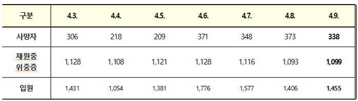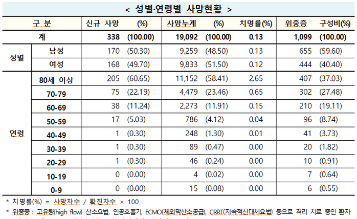 사망자 338명을 연령별로 보면 80세 이상이 205명으로 60.7%를 차지했고, 이어 70대 75명, 60대 38명, 50대 17명, 20대·30대·40대 각 1명이다.
