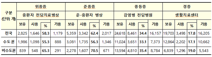 ▲ 9일 0시 기준 코로나19 병상 보유량. [중앙방역대책본부 제공] |