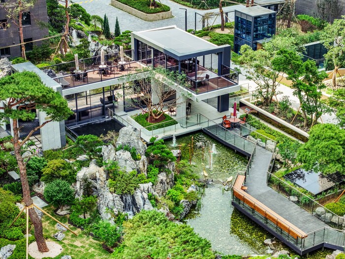 ▲'롯데캐슬 리버파크 시그니처'의 자연풍경과 어우러진 티하우스 카페아트리움. [사진=롯데건설] |