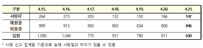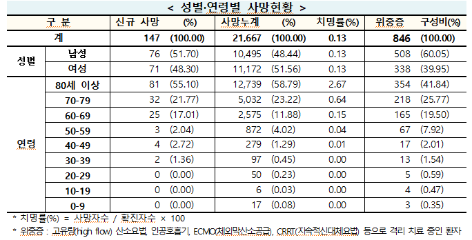 전날 코로나19 관련 사망자는 147명으로 직전일(166명)보다 19명이 적다.