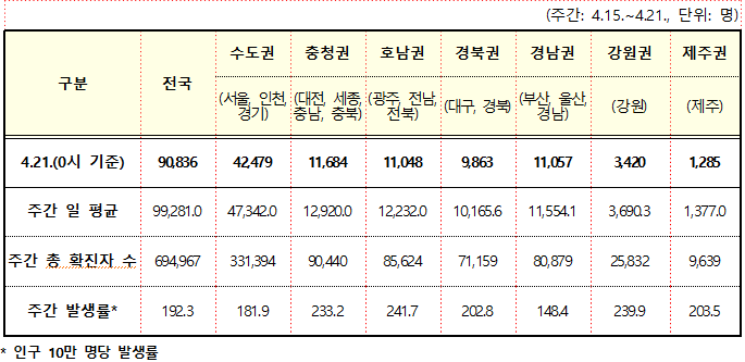 ▲ 권역별 및 일평균 확진자 현황. [중앙방역대책본부 제공] |