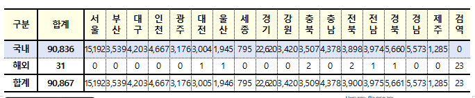 신규 확진자 가운데 지역발생(국내감염)은 9만836명이고 해외유입은 31명이다.