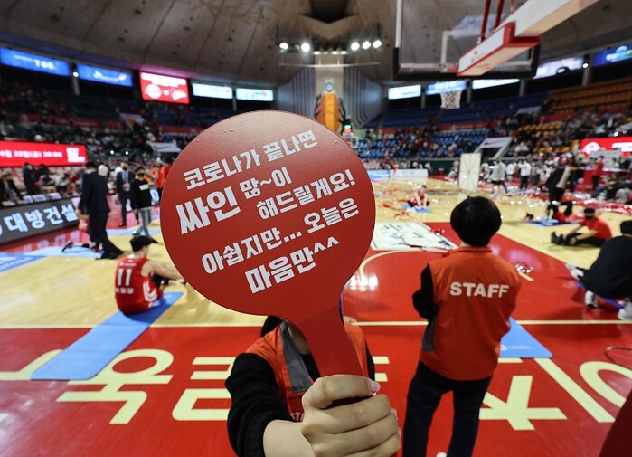 ▲ 지난 20일 오후 서울 송파구 잠실학생체육관에서 열린 프로농구 4강 플레이오프 1차전 SK-오리온 경기가 끝난 뒤 관계자가 팬들에게 사인 요청 자제를 부탁하는 안내판을 들고 있다. [서울=연합뉴스] |