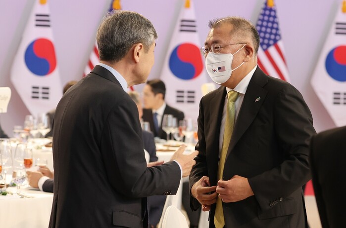 | ▲ 1일 오후 서울 용산 국립중앙박물관에서 열린 조 바이든 미국 대통령 환영 만찬에 참석한 정의선 현대차그룹 회장과 조태용 주미대사 내정자가 대화하고 있다. [서울=연합뉴스] |