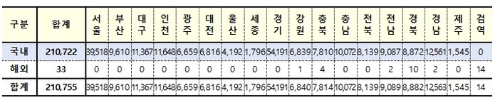 신규 확진자의 감염경로를 보면 지역발생(국내감염)은 21만722명, 해외유입은 33명이었다.