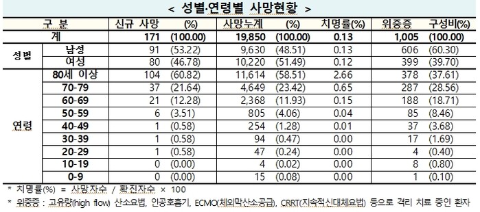 전날 사망자를 연령별로 보면 60세 이상 고령층이 162명으로 94.7%를 차지했다. 80세 이상이 104명(60.8%)으로 가장 많았고 이어 70대 37명, 60대 21명이었다. 60대 밑으로는 50대 6명, 40대·30대·20대 각 1명이다.