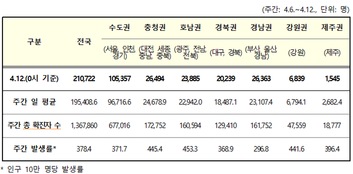 ▲ 12일 0시 기준 권역별 코로나19 국내 확진자 현황. [중앙방역대책본부 제공] |