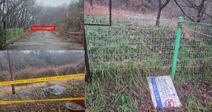 시유지 도로를 무단 점유했던 대문은 흔적으로 미뤄 최근 철거된 것으로 파악됐다. 그러나 현장에는 여전히 외부인 출입을 막기 위한 밧줄 형태의 차단선이 설치돼 있었고, 관리동으로 추정되는 가설 건축물과 정원 관리를 위한 수도 시설도 남아 있었다.