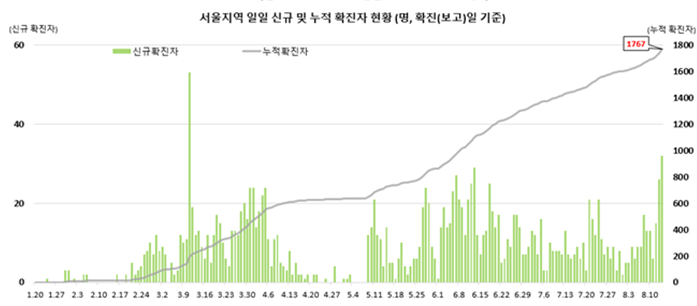 ▲ 서울지역 일일 신규 및 누적 확진자 현황. [출처= 중앙방역대책본부] |