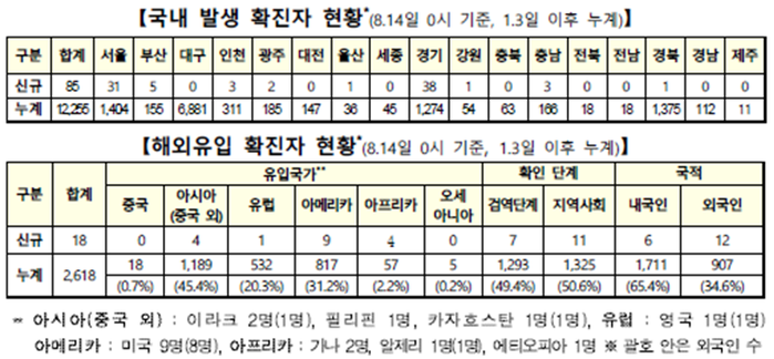 ▲ 14일 0시 기준 코로나19 지역발생 확진자 및 해외유입 확진자 현황. [출처= 중앙방역대책본부] |