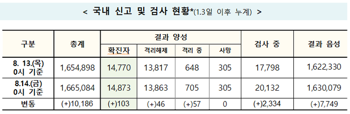 ▲ 14일 0시 기준 코로나19 국내 신고 및 검사 현황. [출처= 중앙방역대책본부] |