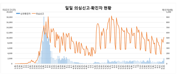 ▲ 코로나19 일일 의심신고 및 확진자 현황. [출처= 중앙방역대책본부] |