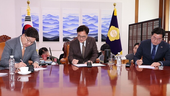 권성동 국민의힘·박찬대 더불어민주당 원내대표는 이날 우원식 국회의장 주재 회동에서 합의안에 서명했다.