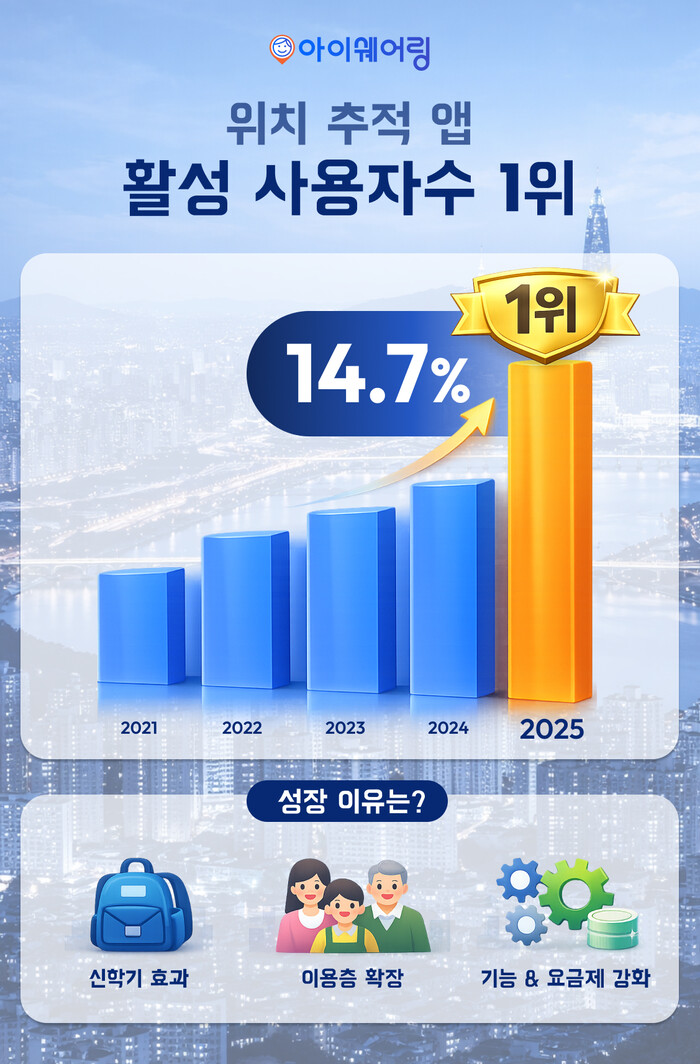 [메가경제=양대선 기자] 글로벌 위치 추적 앱 아이쉐어링의 국내 활성 사용자수가 지난해 12월 기준 374만 명을 기록하며 2024년 동기간 326만 명 대비 14.7% 증가했다. 또한 활성 사용자수 분석 업체 모바일 인덱스 기준으로 동기간 위치 추적 앱 카테고리에서 국내 1위를 차지했다.