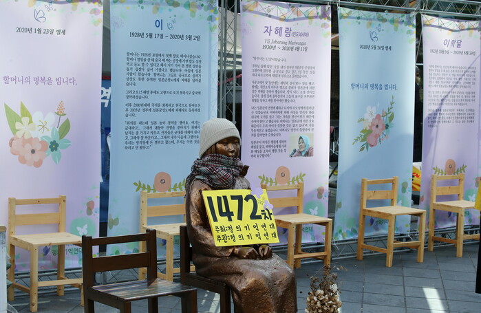 ▲ 지난 12월 30일 오후 서울 종로구 옛 일본대사관 앞에서 열린 '일본군성노예제 문제해결을 위한 제1472차 정기수요시위' 현장에 2020년 돌아가신 일본군 위안부 피해자 할머니를 기리는 글판이 놓여 있다. [사진= 연합뉴스] |