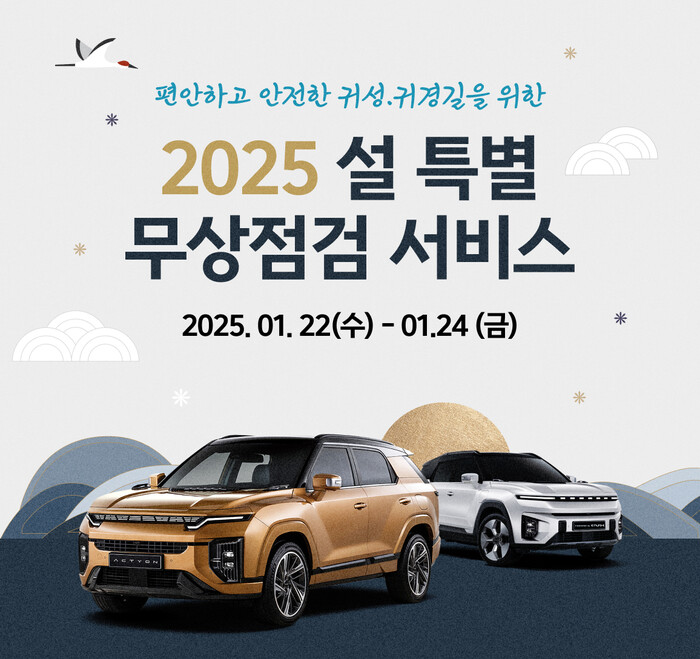 [메가경제=이동훈 기자] KG 모빌리티(이하 KGM)가 한 주 앞으로 다가온 설 명절을 맞아, 장거리 운행으로 고향을 찾는 고객들에게 편의 제공을 위해 ‘2025년 설 특별 차량점검 서비스’를 시행한다고 21일 밝혔다.