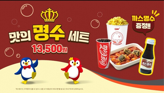 이번 프로모션은 오는 4월 28일부터 5월 11일까지 2주간, CGV 용산아이파크몰점에서 진행된다. 이벤트 기간 동안 매점에서 ‘씨네밀 세트’를 구매한 고객에게는 탄산계 액상 소화제 ‘까스명수액’이 1병이 증정된다.