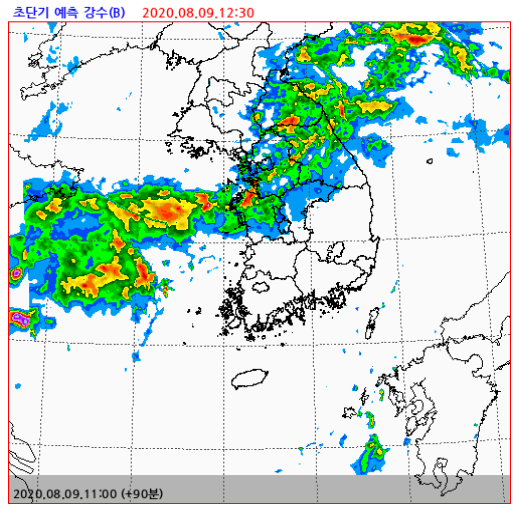 9일 낮 12시 10분 기상청 방재속보에 따르면, 현재 서울, 경기도, 강원도, 충남북부에 시간당 10~30㎜의 강한 장대비가 내리는 곳이 있다.