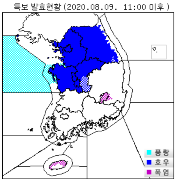 ▲ 9일 오전 11시 현재 호우경보와 호우주의보, 폭염주의보, 풍랑주의보 등 기상특보 발효 현황. [출처= 기상청] |