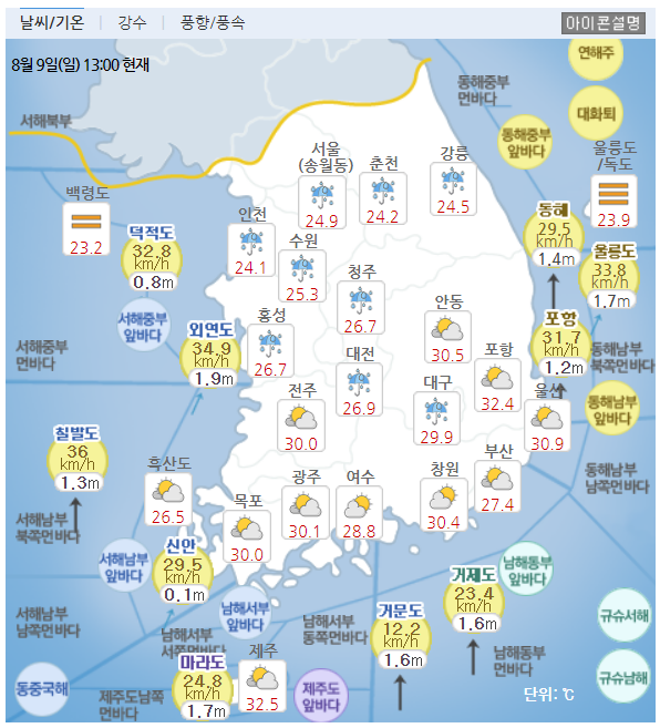 ▲ 9일 오후 1시 현재 전국 날씨 현황. [출처= 기상청] |