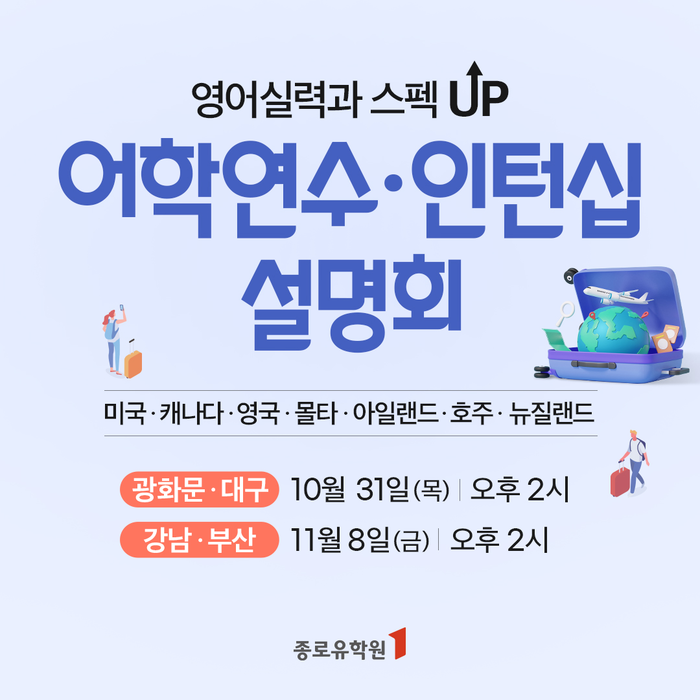 [메가경제=양대선 기자] 종로유학원이 ‘어학연수 & 인턴십 설명회’를 오는 10월 31일 오후 2시 광화문본점(서울 파이낸스 센터)와 대구지사, 11월 8일 오후 2시 강남본점과 부산지사에서 각각 진행한다고 밝혔다.