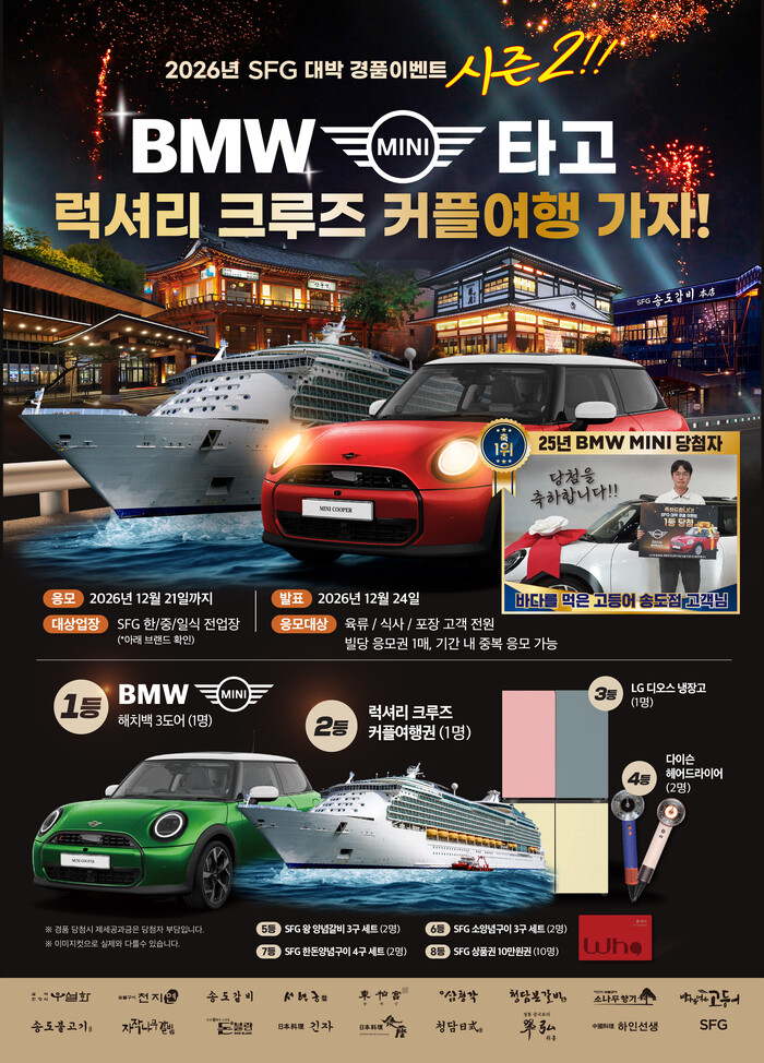 SFG 관계자는 “SFG를 믿고 찾아주시는 고객 한 분 한 분의 평범한 일상에 작은 즐거움과 ‘대박’ 같은 설렘을 드리고 싶은 마음으로 이벤트를 기획했다”며 “올해는 BMW 미니의 행운과 더불어 탁 트인 바다 위에서 즐기는 로맨틱한 럭셔리 크루즈 여행의 기회까지 더해진 만큼, 많은 분들이 그 행운의 주인공에 도전해 보시길 바란다”고 말했다.