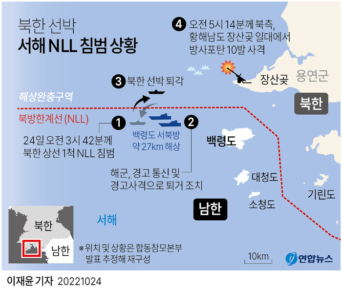 군은 북한이 지난달 25일부터 탄도미사일 발사, 군사분계선(MDL)에 근접한 위협 비행, 9·19 군사합의를 위반한 포병사격에 이어 서해 NLL 도발까지 감행한 것은 고강도 국지적 도발의 명분 축적용일 가능성에도 주목하는 것으로 알려졌다.