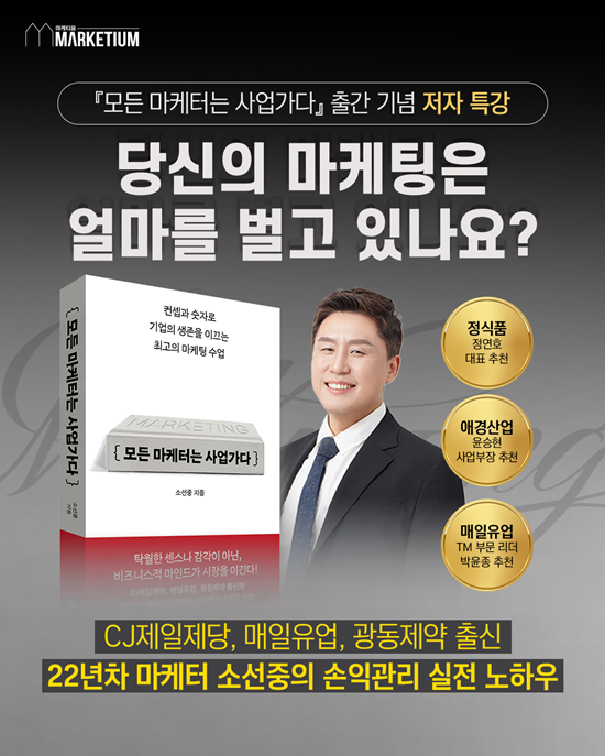 이번 특강은 단순한 출간 기념을 넘어, 책에서 강조한 ‘손익(P&L) 기반의 마케팅’을 현업 마케터들이 실무에 어떻게 적용할 수 있을지 구체적인 가이드를 제공하고 자유로운 질의응답을 나누기 위해 기획됐다. 마케티움은 이번 특강을 통해 현업 마케터들이 가장 어려워하는 분야 중 하나인 ‘손익(P&L)’과 ‘마케팅’ 간의 연결고리에 대한 명쾌한 해답을 제시할 예정이다.