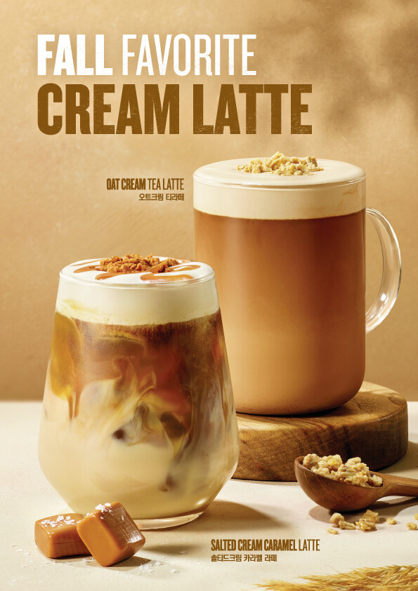신메뉴는 ▲카라멜 라떼에 크림을 올린 '솔티드크림 카라멜 라떼' ▲홍차베이스에 오트 음료와 크림을 더한 '오트크림 티라떼' 등 2종이다. 이번에 처음 내놓는 '오트크림 티라떼'는 식물성 원료인 오트 음료와 크림을 활용했다.