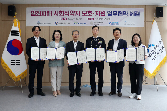 | ▲ 김한영 국가철도공단 이사장이 28일 세종자치경찰위원회에서 진행된 '범죄피해 사회적약자 보호지원 업무협약'을 체결하고 기념촬영을 하고있다.(왼쪽부터 정승욱 세종변호사회 지회장, 장은정 세종 YWCA성인권상담센터장, 김한영 이사장, 손장목 세종경찰청장, 나승권 세종자치경찰위원회 위원장, 김미경 종촌가정성폭력통합상담소장) |