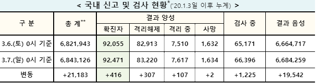 ▲ 7일 0시 기준 코로나19 국내 신고 및 검사 현황. [출처= 중앙방역대책본부] |
