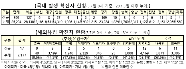 신규 확진자 중 지역발생 확진자는 399명, 해외유입은 17명이다. 전날보다 지역발생은 5명이 적으나 해외유입은 3명이 많다.