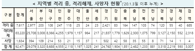▲ 7일 0시 기준 코로나19 지역별 격리 및 해제 현황. [출처= 중앙방역대책본부] |