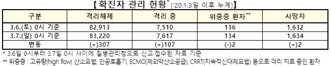 ▲ 7일 0시 기준 코로나19 확진자 관리 현황. [출처= 중앙방역대책본부] |