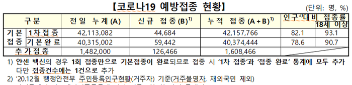 코로나19 예방접종대응추진단에 따르면, 19일 0시 기준 1차접종은 전날 4만4684명이 새롭게 맞아 총 4215만7766명을 기록했다. 이중 5만9442명이 기본접종(1차·2차 접종)을 새롭게 완료해 기본접종 완료자는 총 4037만4444명으로 늘었다.