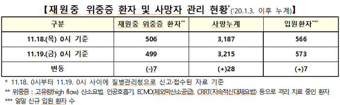 ▲ 19일 0시 기준 코로나19 위중증환자 및 사망자 관리 현황. [질병관리청 제공] |
