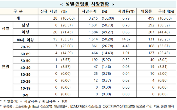 하루 새 28명이 더 목숨을 잃으면서 누적 사망자는 3215명으로 늘었다. 누적 평균 치명률은 0.79%를 기록했다.