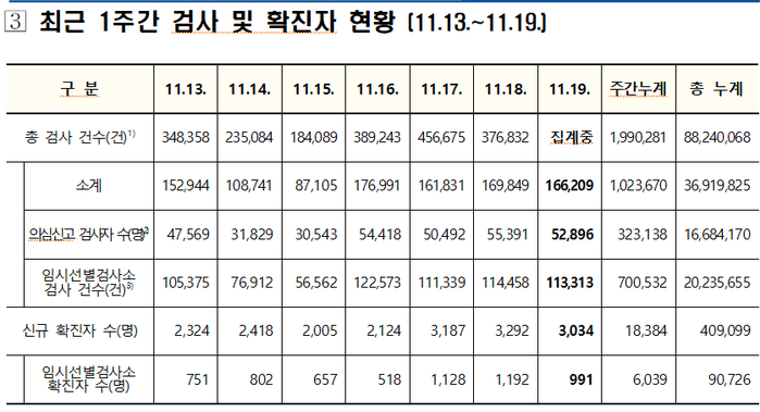 중앙방역대책본부(방대본)은 19일 0시 기준으로 코로나19 신규 확진자가 3034명이 발생해 지금까지 누적 확진자 수는 총 40만9099명(해외유입 1만5472명)으로 집계됐다고 밝혔다.