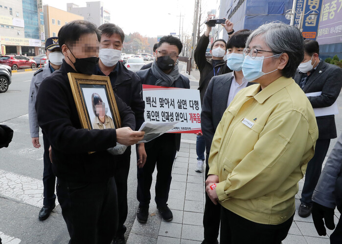 ▲ 코로나19백신피해자가족협의회(코백회) 회원들이 19일 충북 예방접종 위탁의료기관인 청주시 하나병원 앞에서 추가접종을 하고 병원을 나서는 정은경 질병관리청장을 만나 면담을 요구하고 있다. [청주=연합뉴스] |