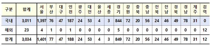 신규 확진자 중 전국 곳곳에서 발생한 국내발생(이하 지역발생)은 3011명이었고 해외유입은 전날보다 3명이 많은 23명이었다.