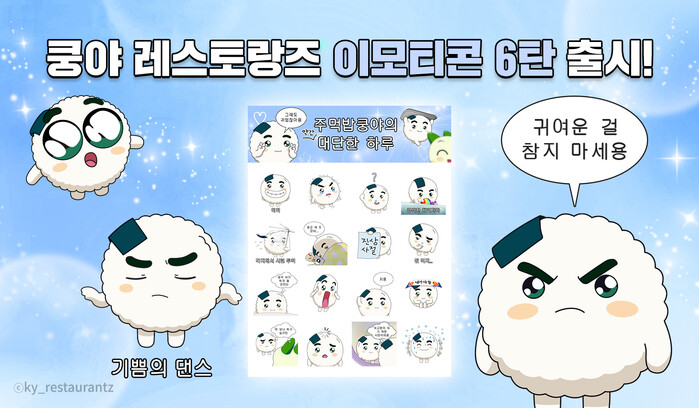 6번째로 선보이는 이번 이모티콘은 쿵야 레스토랑의 알바생이자 멀티 플레이어 멤버 주먹밥쿵야의 하루를 담은 32종의 이모티콘 구성으로 카카오 이모티콘샵에서 구매할 수 있다. 최근 출시된 <양파쿵야의 눈물나게 대단한 하루>와 함께 사용하면 서로 대화를 주고받을 수 있도록 구성됐다.