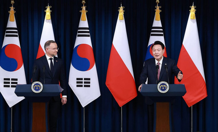 | ▲ 윤석열 대통령과 안제이 두다 폴란드 대통령이 지난 10월 24일 서울 용산 대통령실에서 열린 한·폴란드 공동언론발표에서 취재진의 질문을 받고 있다.[사진=연합뉴스] |