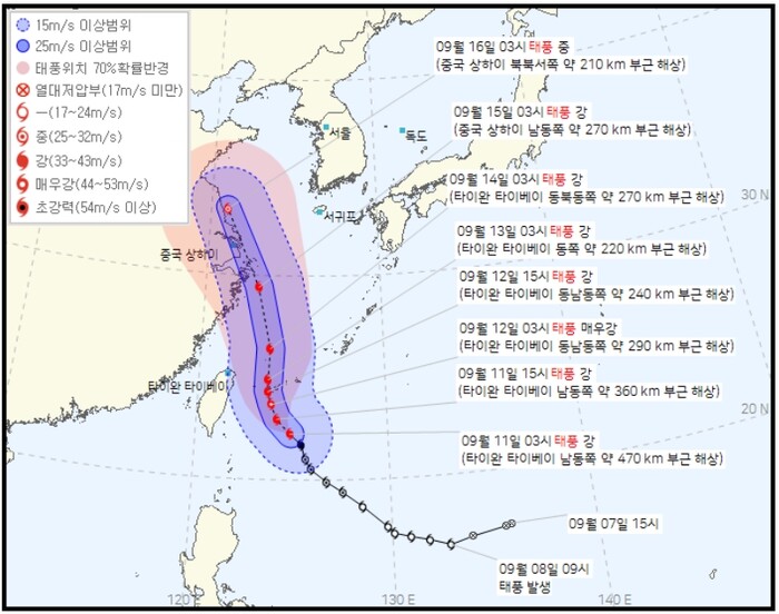 기상청 예보의 예상 태풍경로를 보면, 16일 오전 9시 태풍위치 70% 확률의 예상반원에 황해는 상당 부분 포함되지만 한반도는 빠져 있다. 특히 초속 25m 이상의 강풍이 몰아칠 위험반원에 들 가능성은 없는 것으로 보인다.