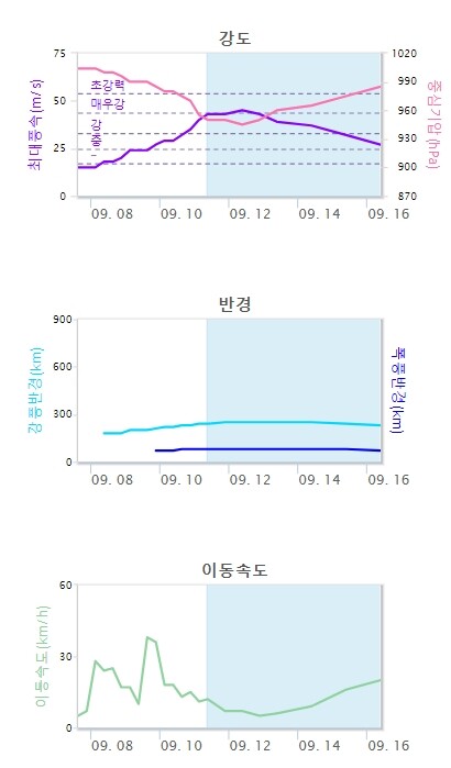 15일 오전 9시에는 중심기압 975hPa, 최대풍속 초속 32m(시속 115km), 강풍반경 240km(남서 약 190km)이고, 16일 오전 9시에는 중심기압 985hPa, 최대풍속 초속 27m(시속 97km), 강풍반경 230km(남서 약 180km)로 예상된다.