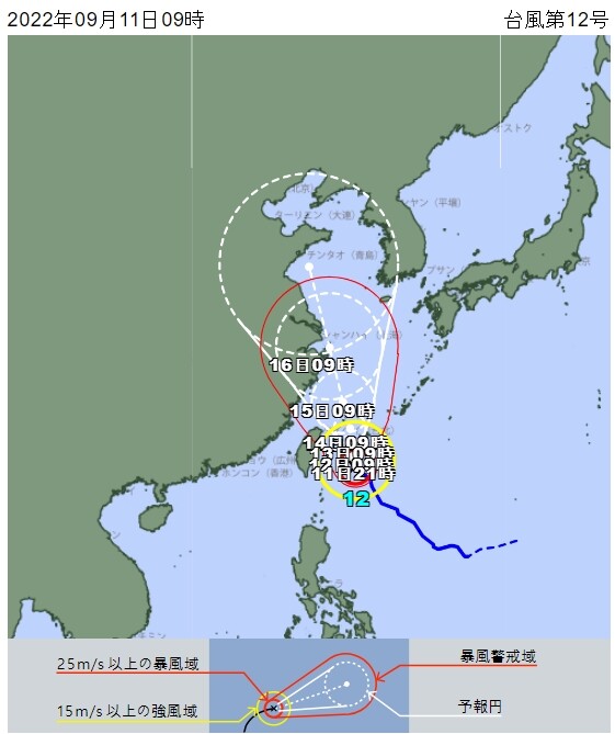 | ▲ 일본 기상청의 11일 오전 9시 기준 12호 태풍 무이파 예상 경로. [출처=일본 기상청 홈페이지] |