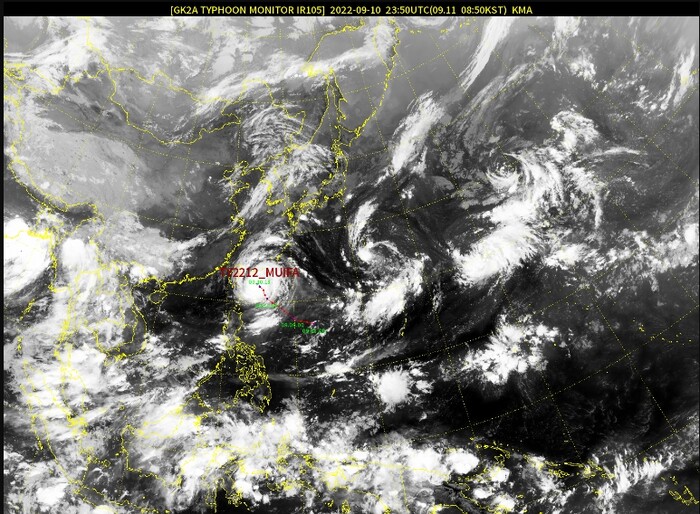 11일 오전 9시 현재 타이완 타이베이 남동쪽 약 410㎞ 부근 해상(북위 22.6도, 동경 124.5도)에서 시속 12㎞의 느린 속도로 서북서진하고 있다.