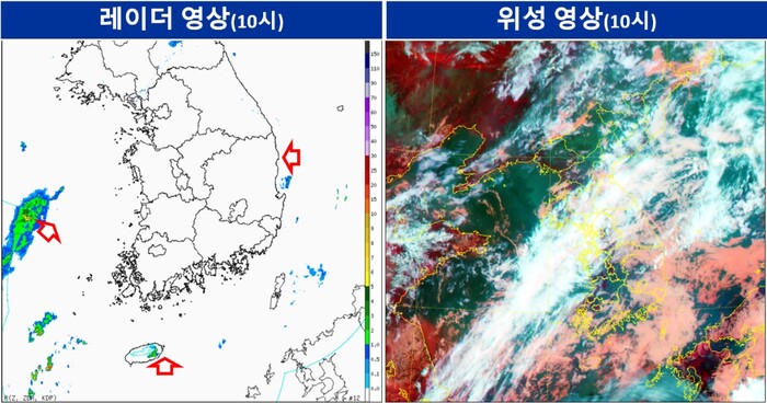 | ▲ 11일 오전 10시 기준 우리나라 상공의 레이더 영상과 위성 영상. [출처=기상청 날씨누리] |