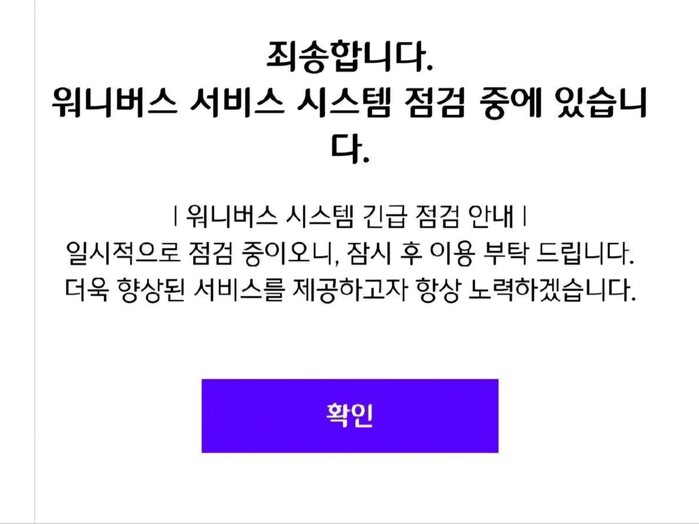 | ▲ 최근 워니버스는 '서비스 시스템 점검 중'이라는 공지를 게재했다.[사진=워니버스 캡처] |
