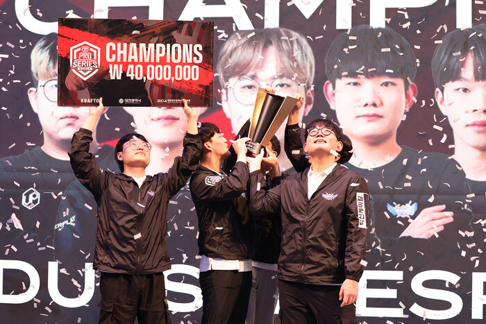 ▲ PMPS 2023 시즌 3 파이널 우승팀 '덕산 이스포츠'가 우승 세리머니를 하고 있다. [사진=크래프톤] |